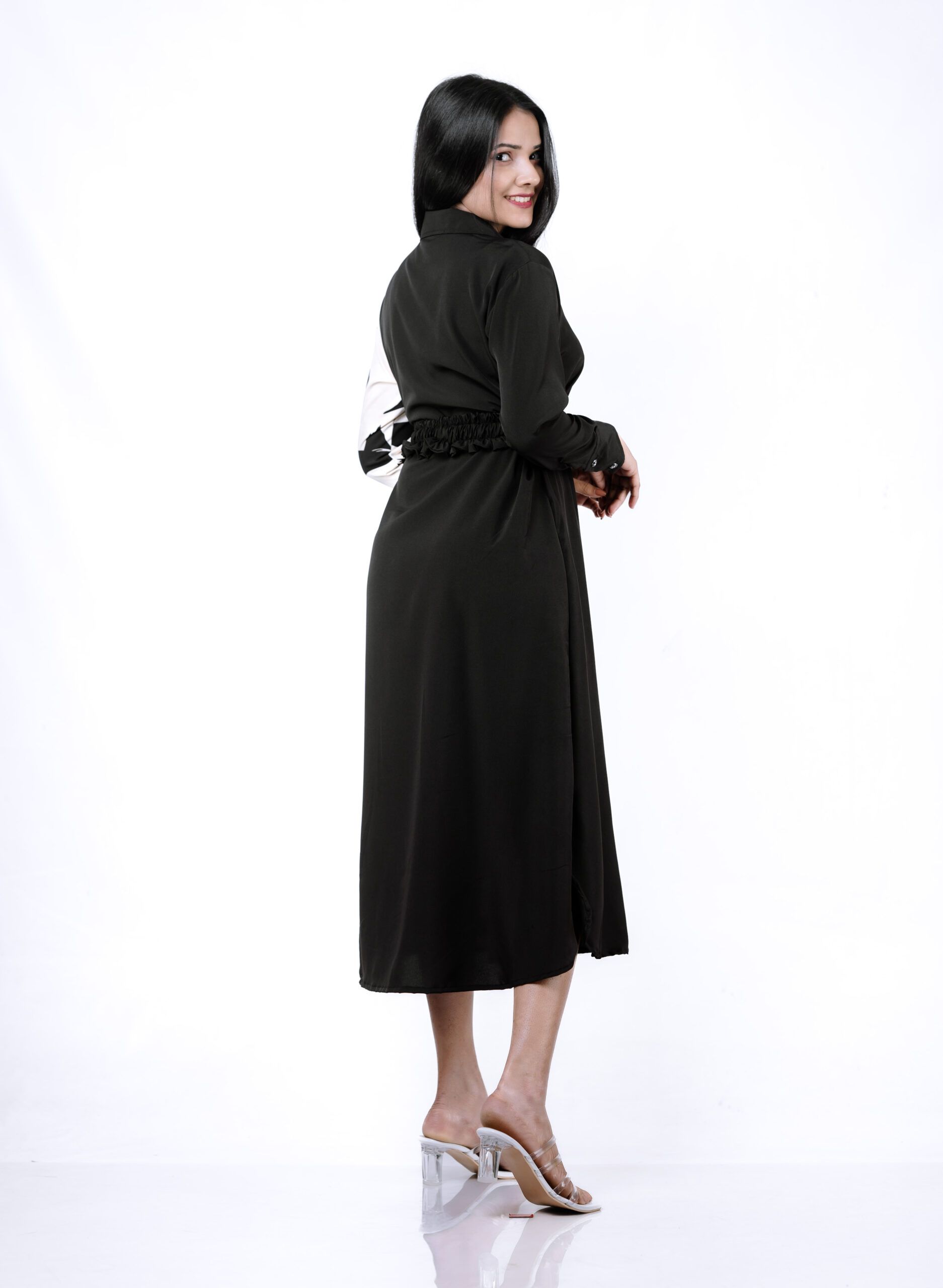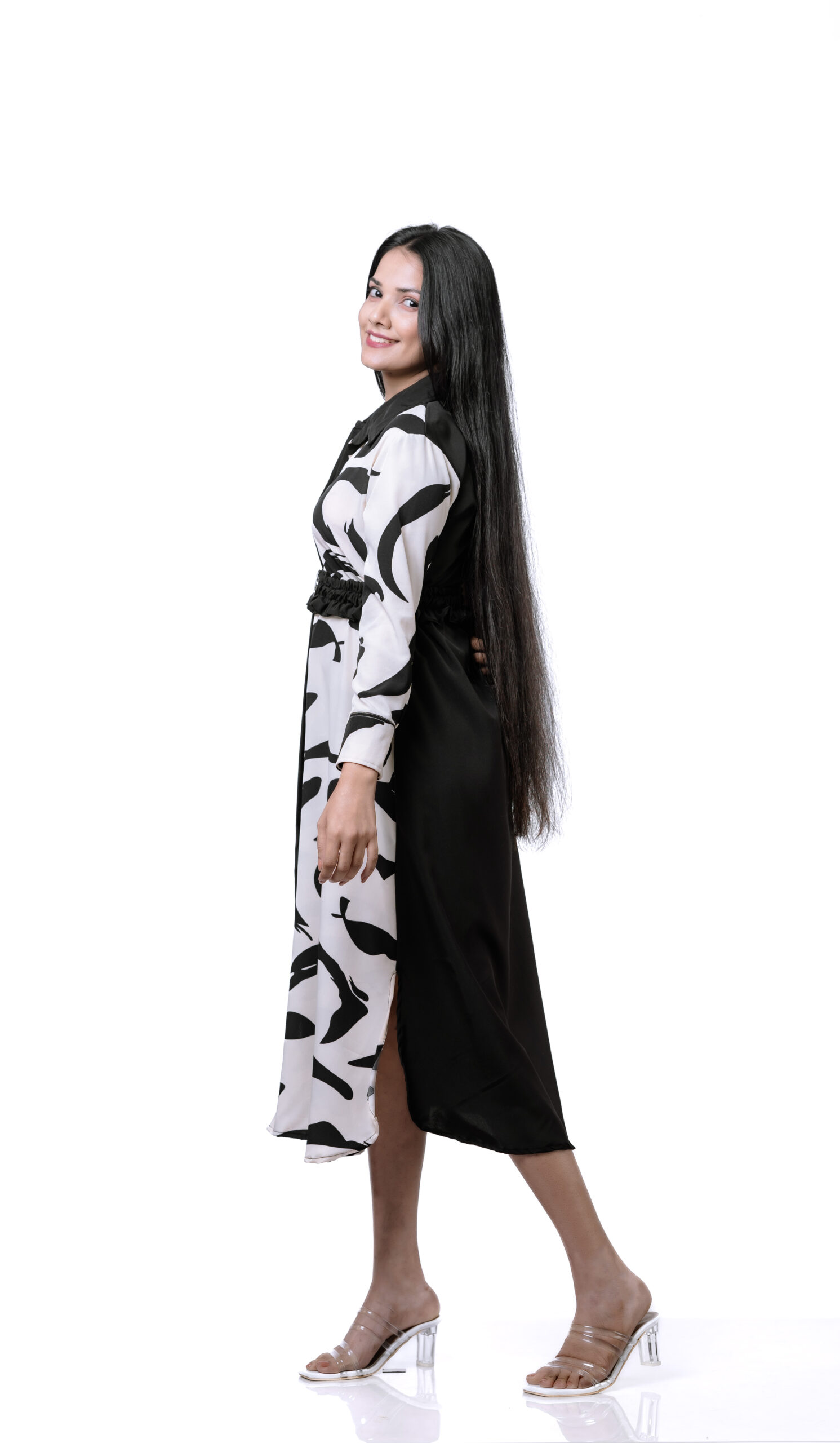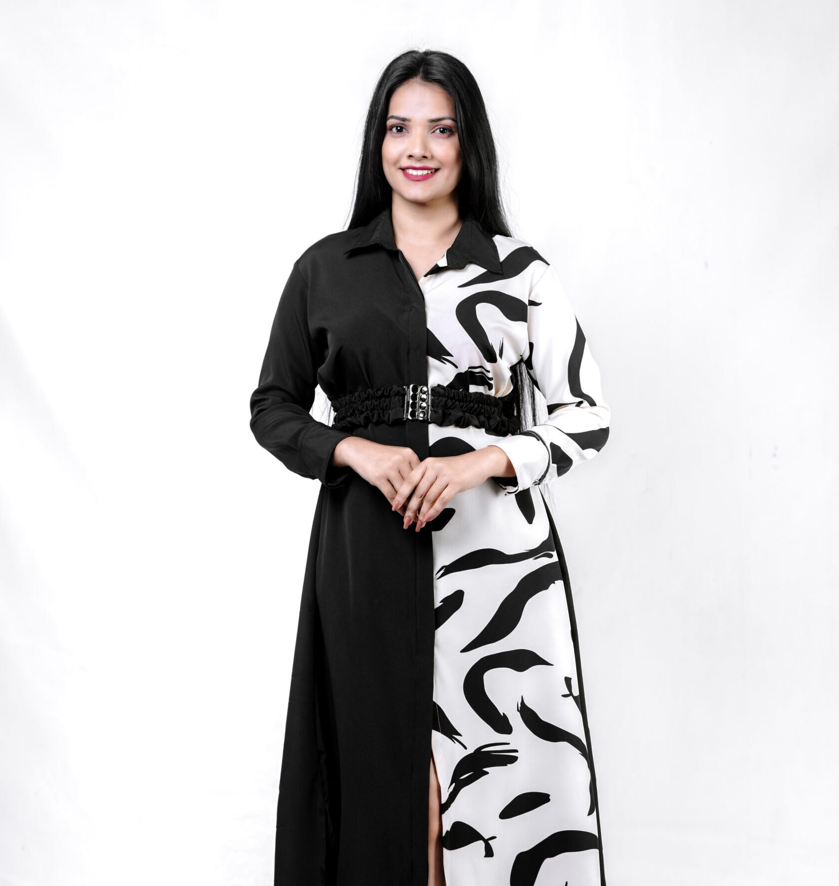 Elevate your wardrobe with the Eclipse Elegance Two Toned Dress, a striking blend of bold style and timeless sophistication. This long-sleeved, button-down dress features a unique half-and-half design, with one side in solid black and the other showcasing an abstract black pattern on a white background. The collared neckline and front slit add a touch of classic elegance, while the cinched waist with a black belt accentuates your silhouette. Perfect for making a statement at any event, this dress combines artistic flair with a refined, chic look.