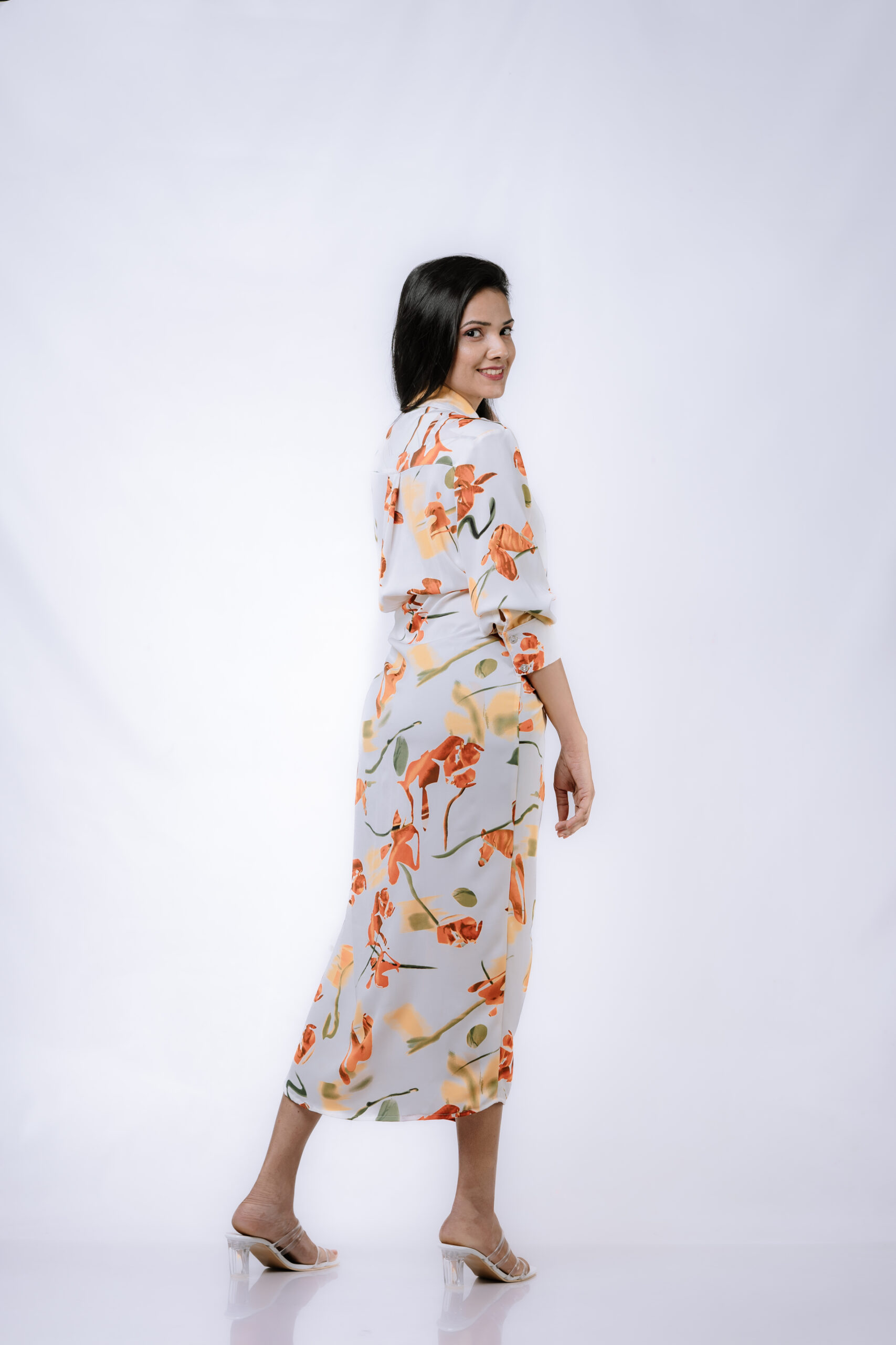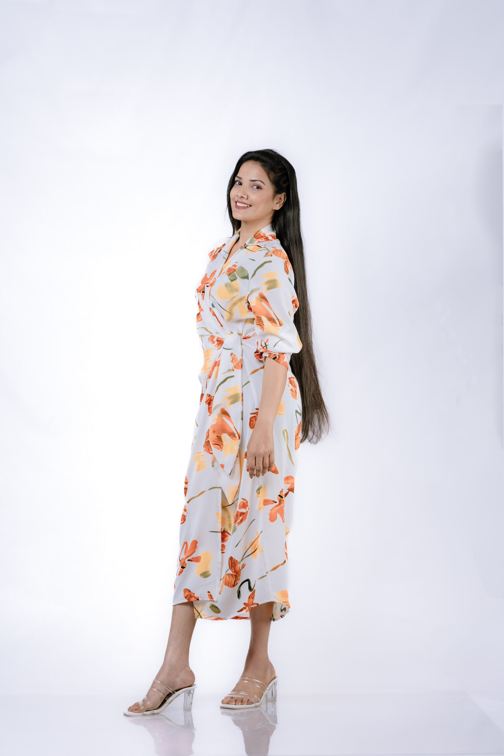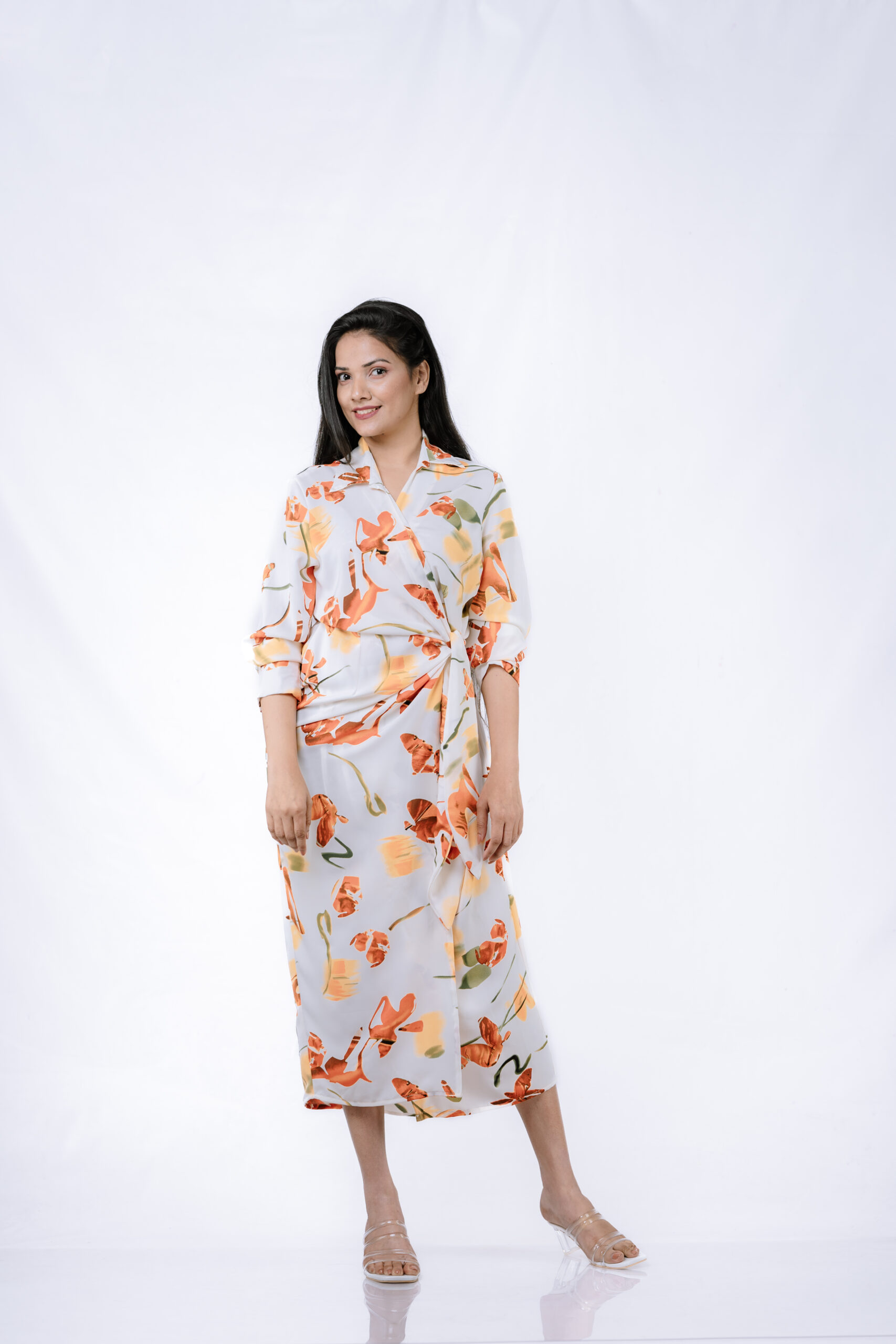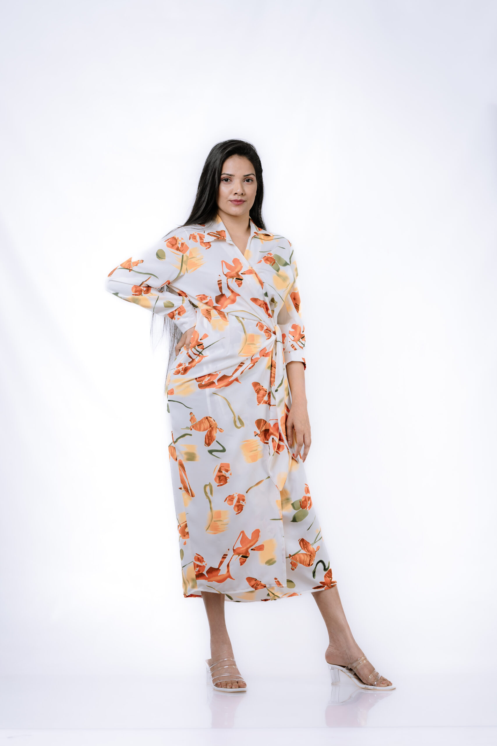Pair this dress with our clear open-toe sandals for a chic and polished look. Whether it’s a garden party or a casual outing, this floral wrap dress ensures you stand out with style and elegance.